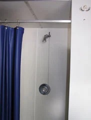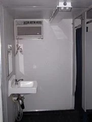 This trailer provides a total of 10 shower heads. You have the choice between dividing the trailer with a partition to provide 2 rooms with 5 stalls, or 1 large 10 stall trailer. Also provided are 2 porcelain sinks and 2 electric hand dyers both positioned inside the trailer.