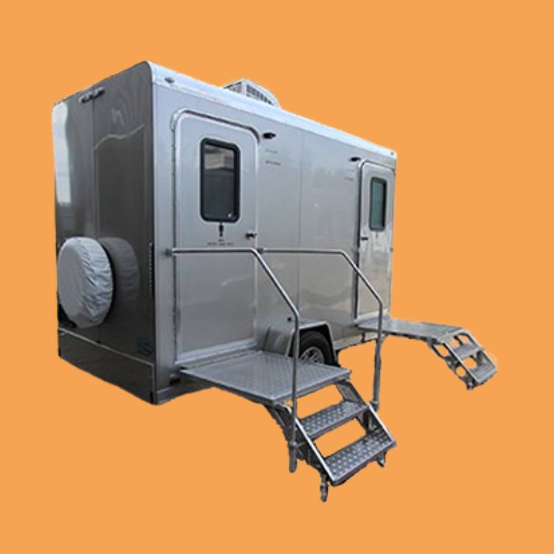 The 2-Stall Portable Restroom Trailer includes a smooth durable white fiberglass interior, insulated walls and ceiling, and one-piece aluminum seamless roof with smooth siding. Easy access for guests of all ages with 2 easy steps with full landing and double handrails. Abundant porch lighting at each entry door and 1-piece non-skid rubber flooring ensure your guests can enter and exit safely and securely no matter what time of day or night. Your guests will also enjoy the comfort of a fully climate-controlled environment maintained by air conditioning and heat strips!