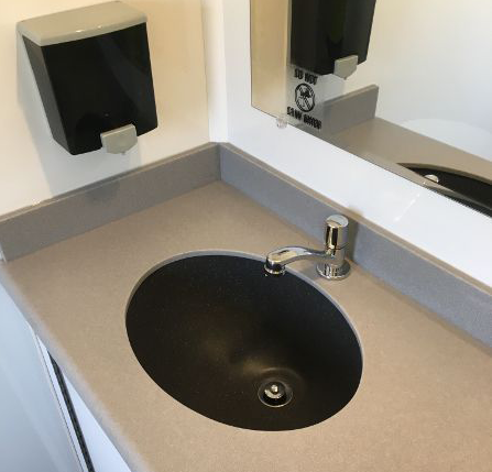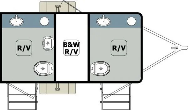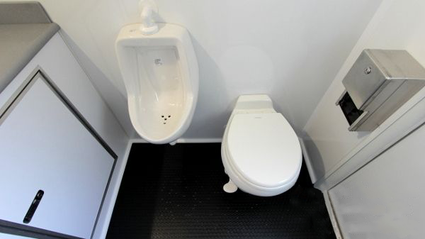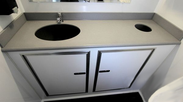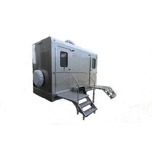 The 2-Stall Portable Restroom Trailer offers a durable and easy-to-maintain environment with an attractive design. Each suite includes a water-saving china pedal flush toilet, toilet paper holder, wall-to-wall lockable vanity with solid surface countertops with an under-mounted sink, a large shatterproof mirror, metered faucets, and an in-counter wastebasket with soap and paper towel dispenser. The men’s suite also includes a water-saving urinal. It has a freshwater onboard tank with 125 gallons and a blackwater tank with 370 gallons.