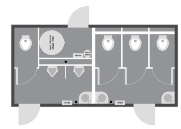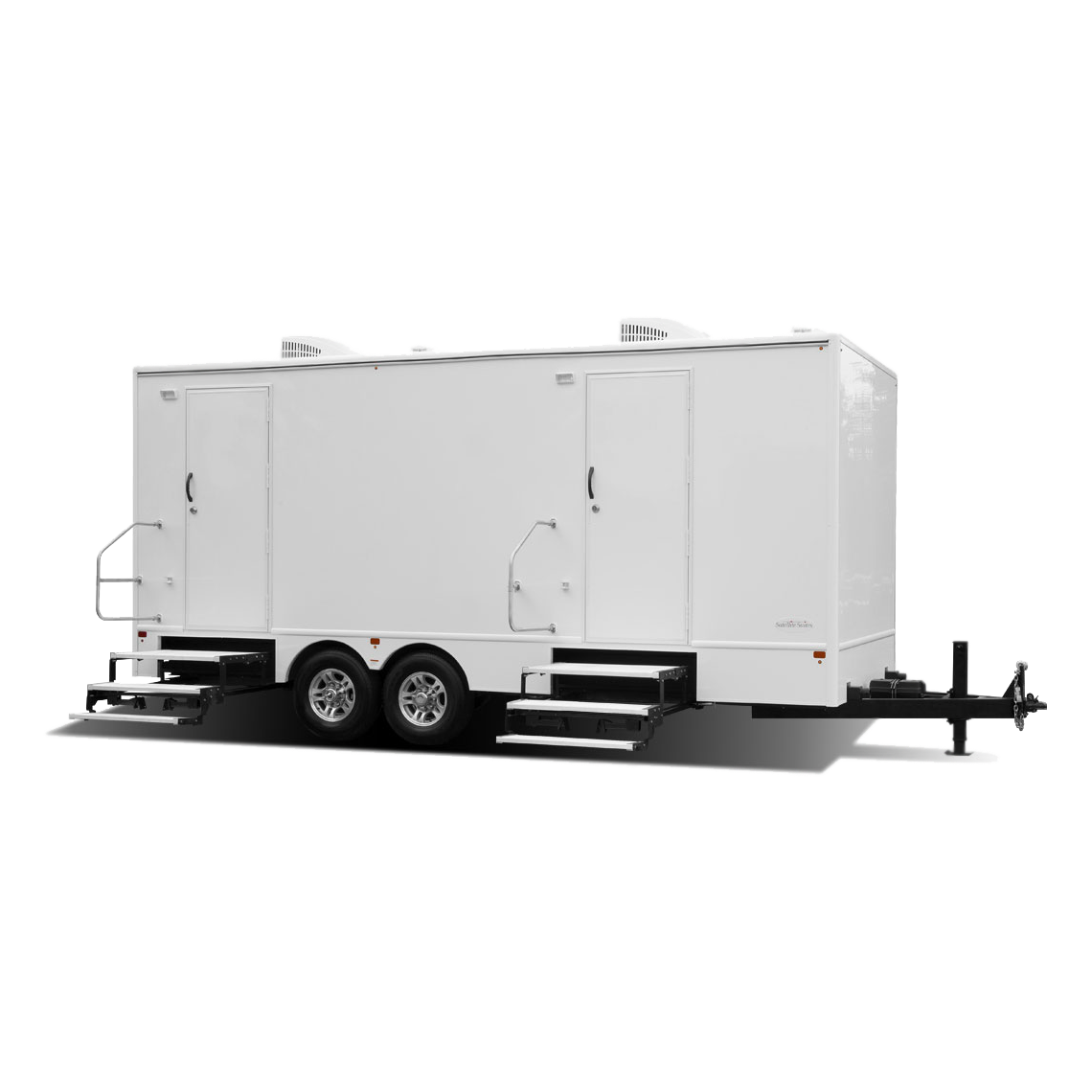 The 6-stall 21′ mobile restroom trailer is a nice compact trailer for your event needs. Ideal for large parties, special events, or weddings. Used alone or in combination with other facilities, portable restrooms and handicap restrooms, this trailer will keep those lines down and handle numerous people. Valet attendants (ours or yours) are recommended.