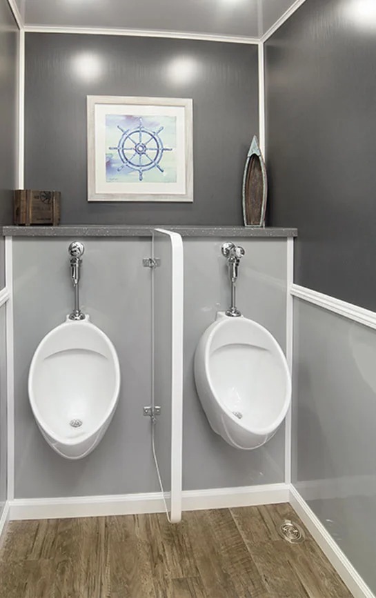 The women’s side features 3 enclosed stalls and 2 porcelain sinks with mirrors. The men’s side features 1 enclosed stalls, 2 urinals, and 1 porcelain sink with mirror to accommodate your guests.