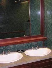 The women’s side features 4 enclosed stalls and 3 porcelain sinks with mirrors. The men’s side features 2 enclosed stalls, 3 urinals and 2 porcelain sinks with mirrors.